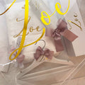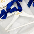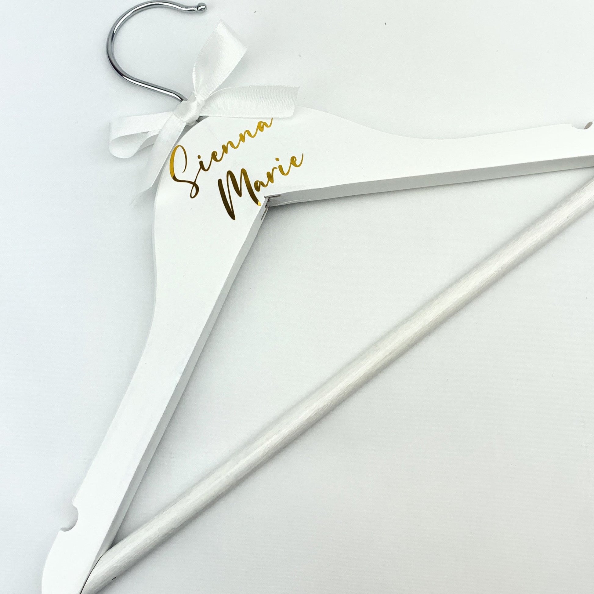 A white wooden personalised hanger, children's size. Dimensions: 30.5cm wide with ribbon.