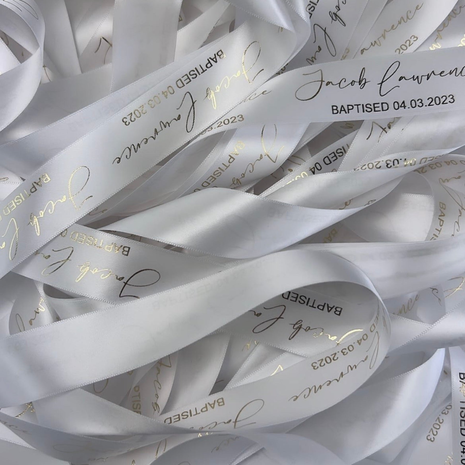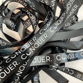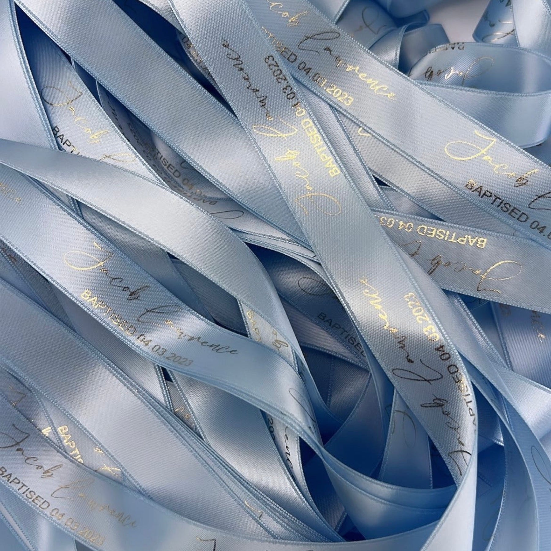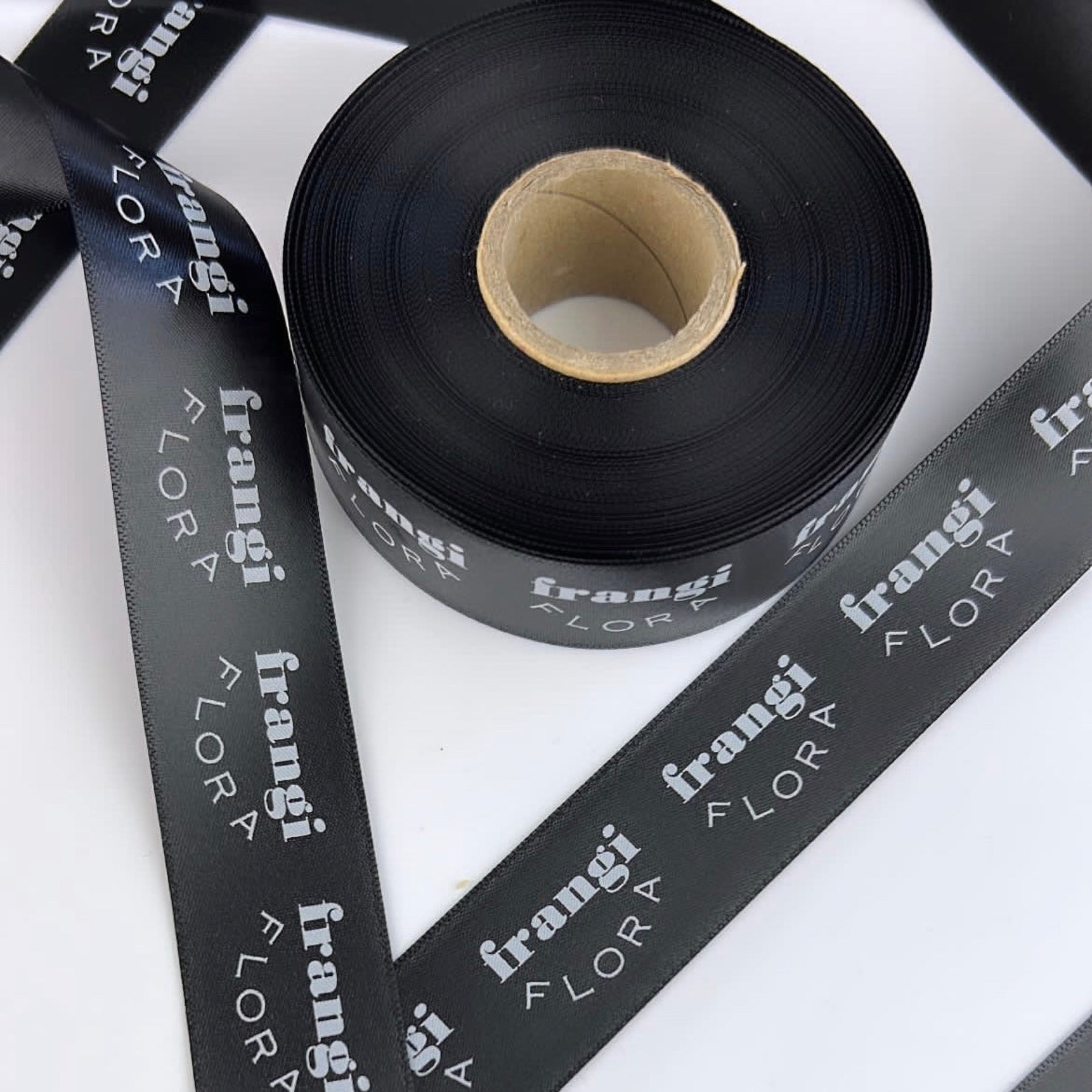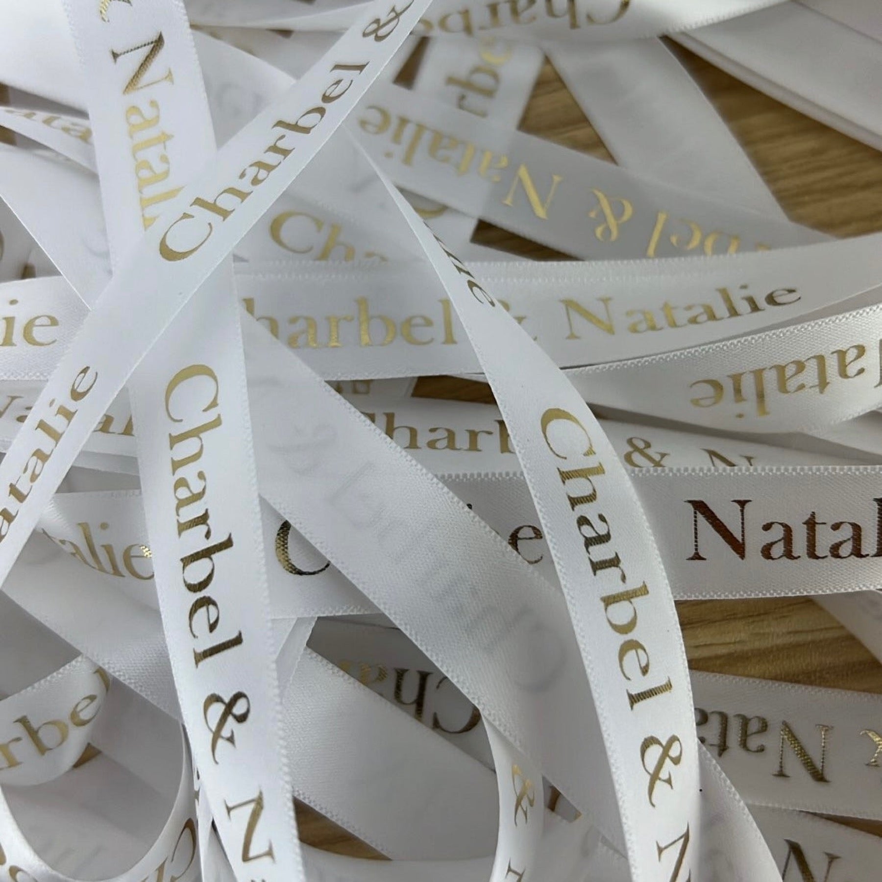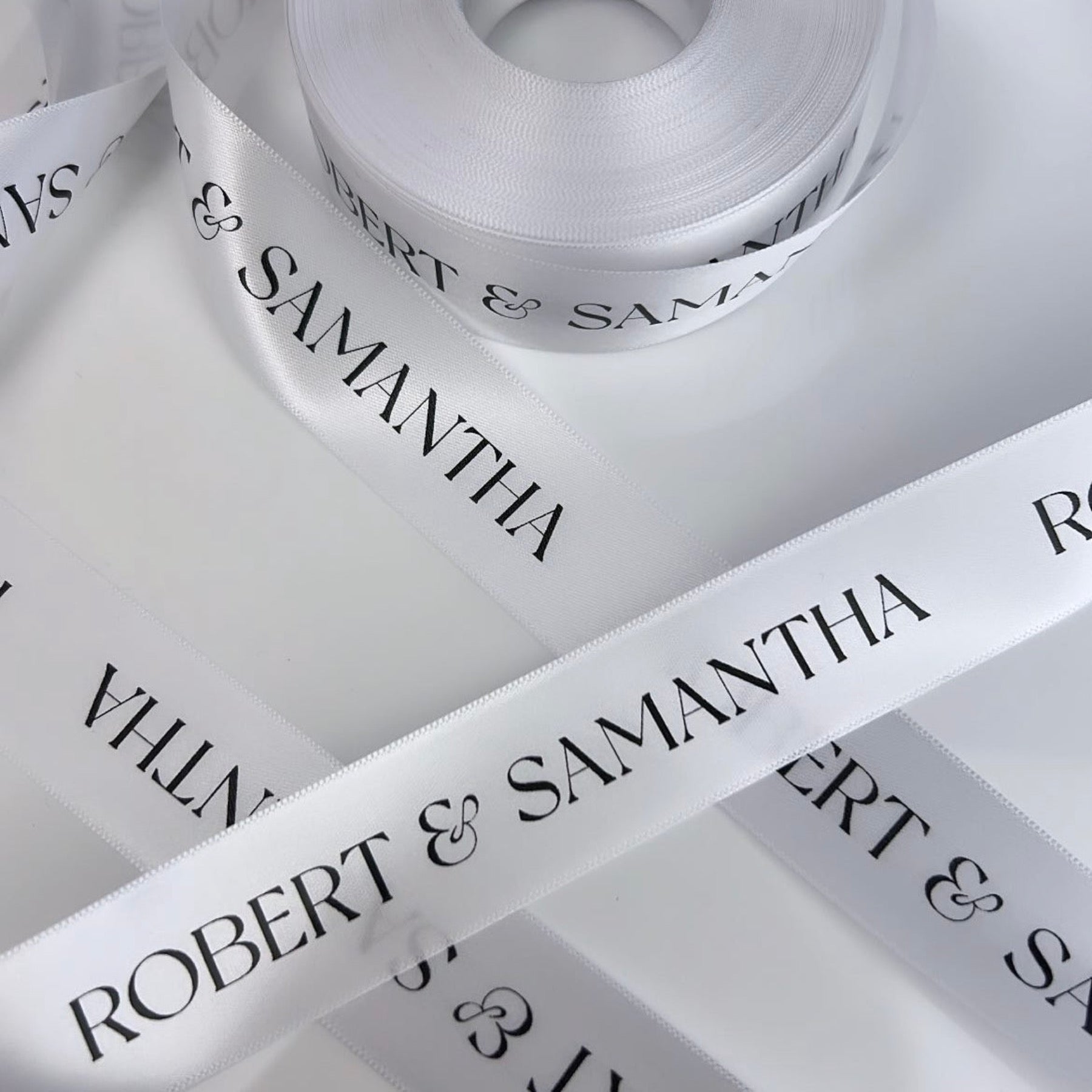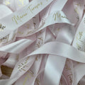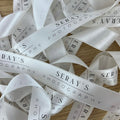 Double Sided Woven Edged Satin Ribbon personalised with text or image of choice. Text is only printed on one side, but the finish is lustrous on both sides.